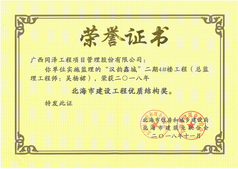 漢韻鑫城二期4#樓工程項目榮獲2018年度“建設(shè)工程優(yōu)秀結(jié)構(gòu)獎”