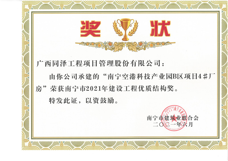 南寧空港科技產(chǎn)業(yè)園B區(qū)4#廠房項目榮獲2021年度建設(shè)工程優(yōu)質(zhì)結(jié)構(gòu)獎