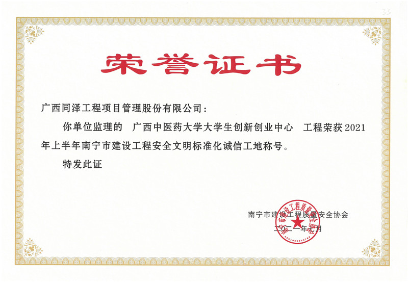 廣西中醫(yī)藥大學(xué)實訓(xùn)樓項目、大學(xué)生創(chuàng)新創(chuàng)業(yè)中心項目榮獲2021年度安全文明標(biāo)準(zhǔn)化工地