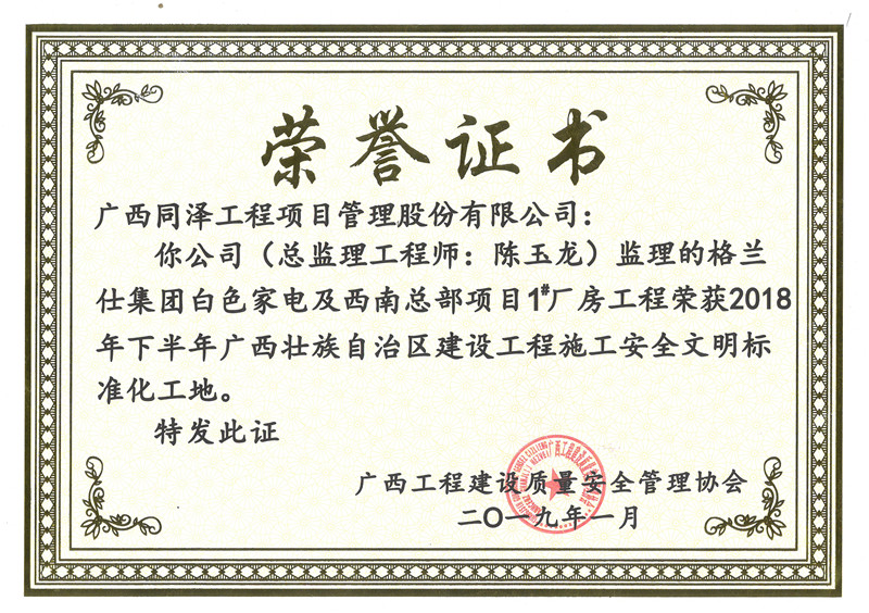 格蘭仕集團(tuán)白色家電及西南總部項目榮獲2018年度安全文明標(biāo)準(zhǔn)化工地