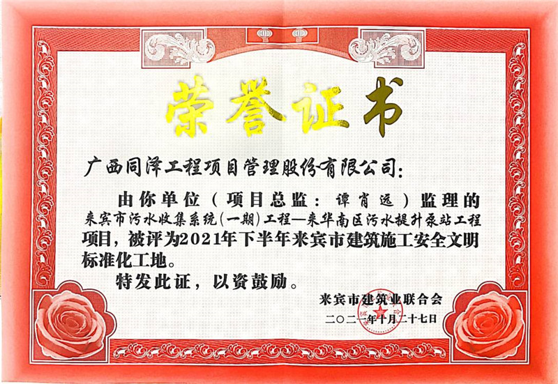 來賓市污水收集系統(tǒng)(一期)工程——來華南區(qū)污水提升泵站工程榮獲2021年度安全文明標(biāo)準(zhǔn)化工地