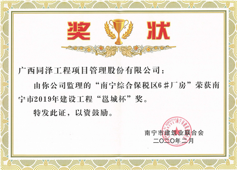 南寧綜合保稅區(qū)6#廠房項目榮獲2019年建設(shè)工程“邕城杯”獎
