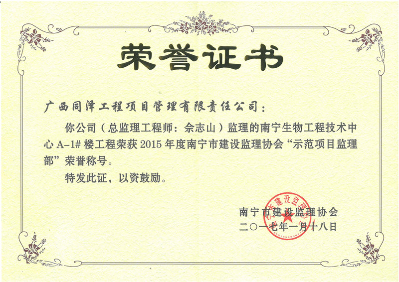 南寧生物工程技術中心A-1#樓項目榮獲2015年度“示范項目監(jiān)理部”榮譽稱號