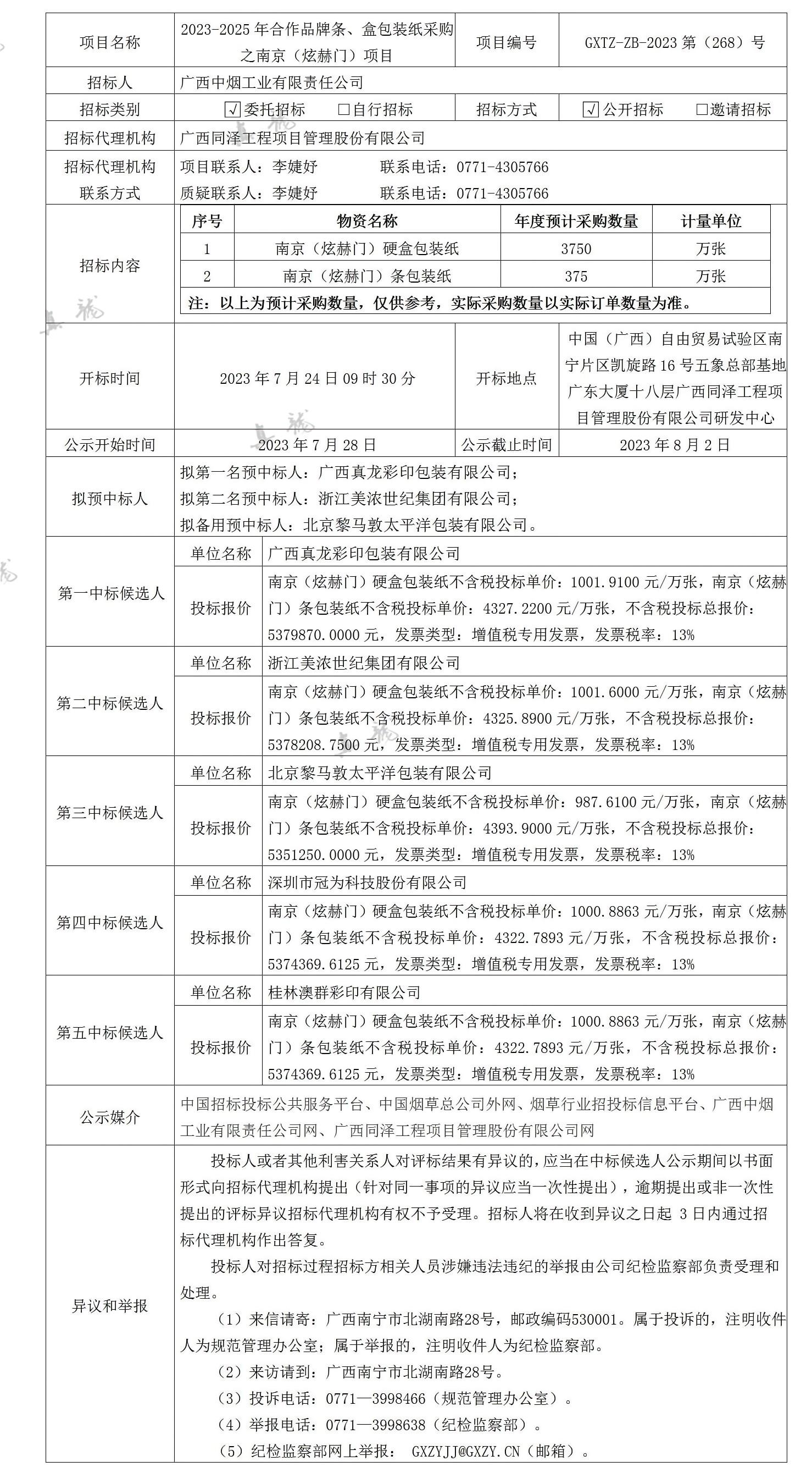 廣西中煙工業(yè)有限責任公司2023-2025年合作品牌條、盒包裝紙采購之南京(炫赫門)項目(項目編號:GXTZ-ZB-2023第(268)號)中標候選人公示