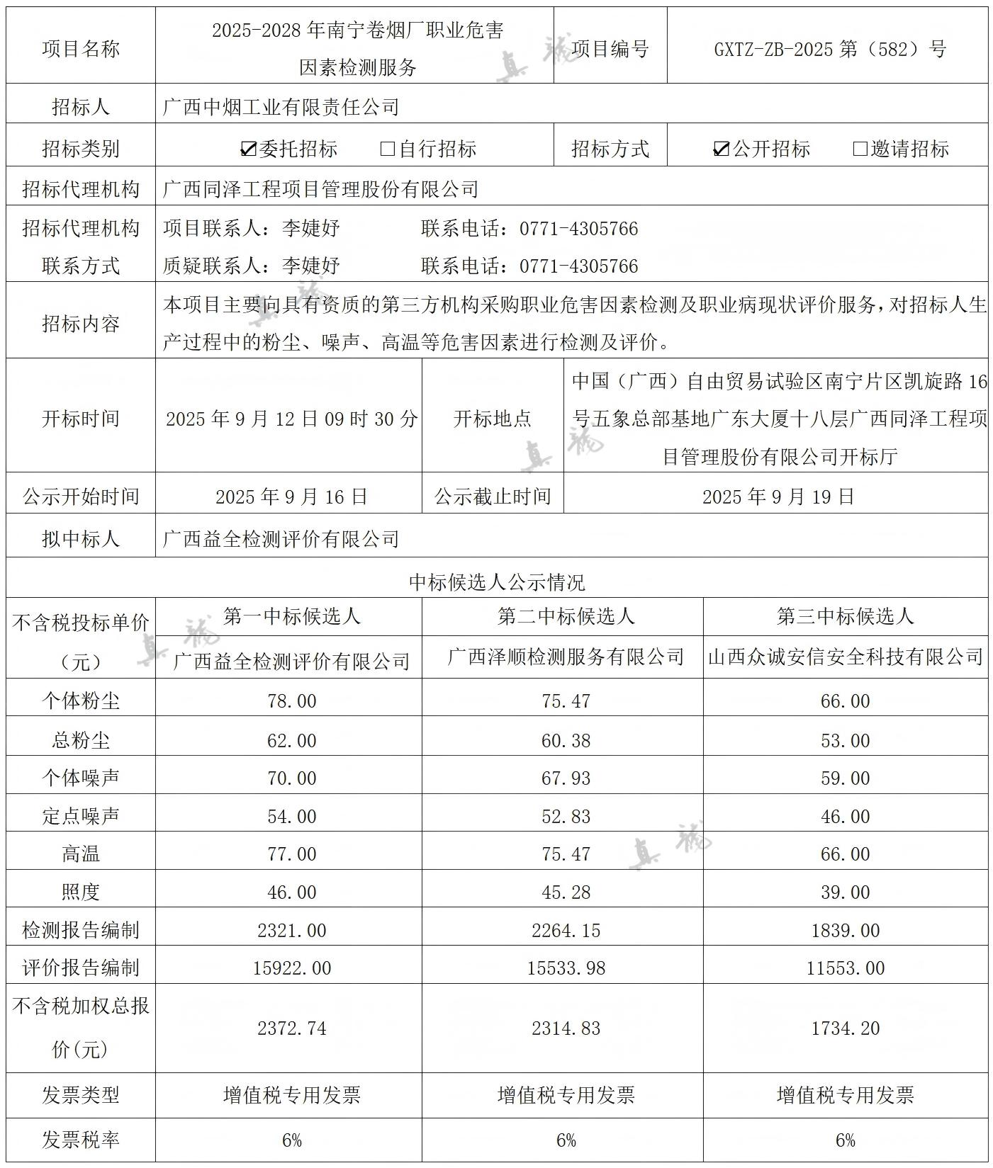 廣西中煙工業(yè)有限責(zé)任公司2025-2028年南寧卷煙廠職業(yè)危害因素檢測(cè)服務(wù)(項(xiàng)目編號(hào):GXTZ-ZB-2025第(582)號(hào))中標(biāo)候選人公示